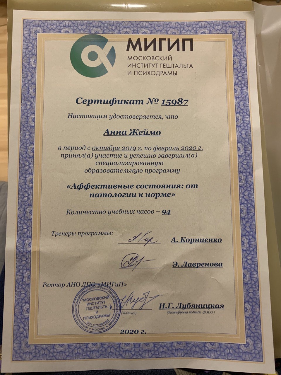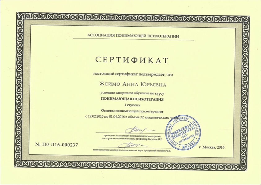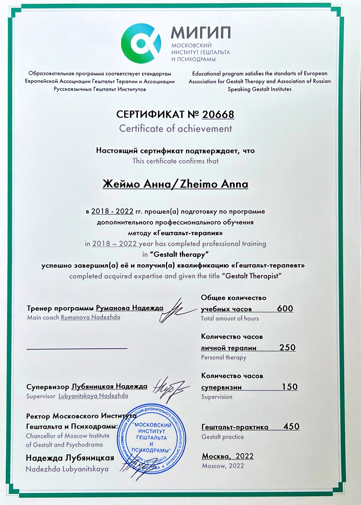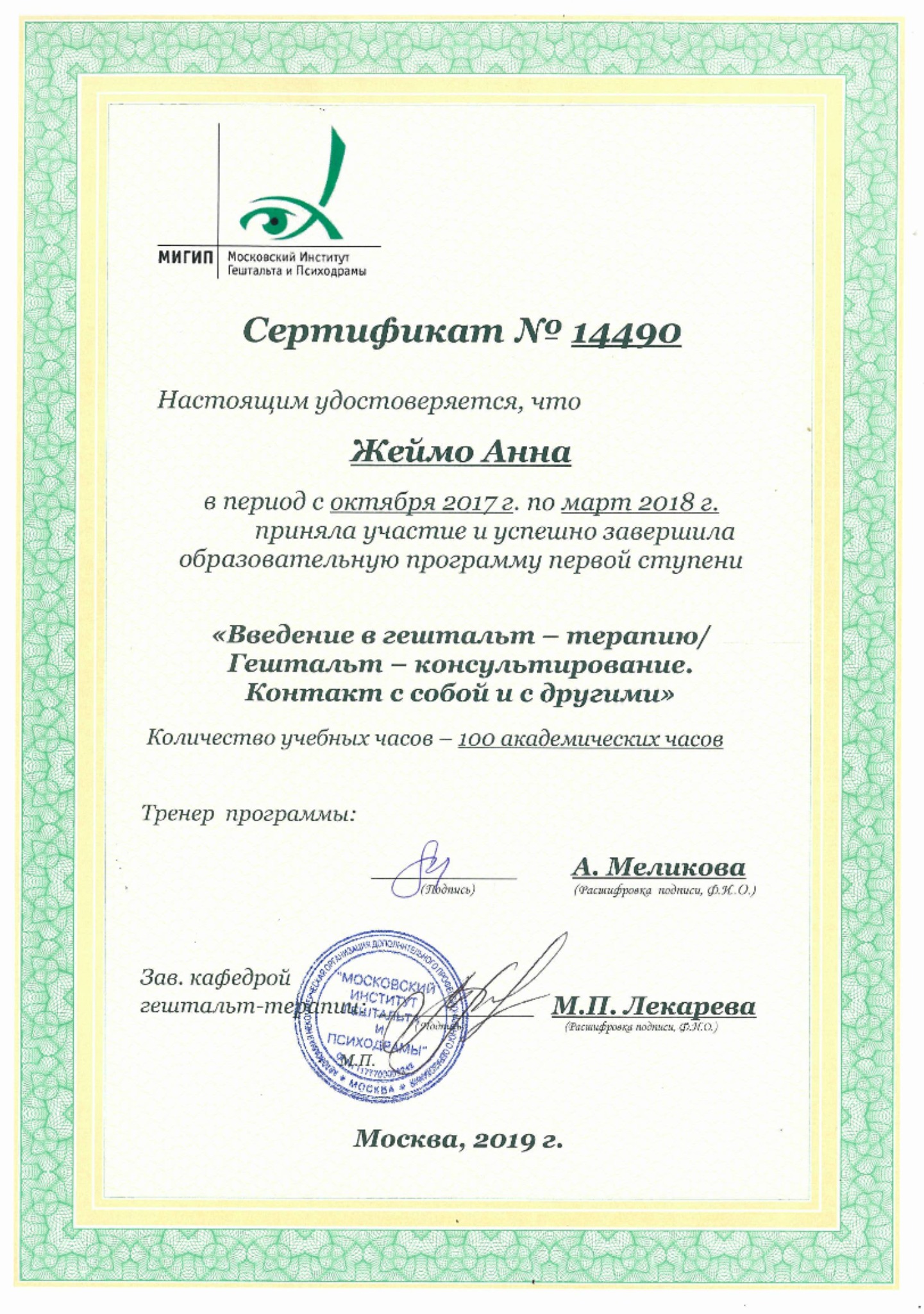 Гештальт-терапия (Московский институт гештальта и психодрамы, сертифицирована)