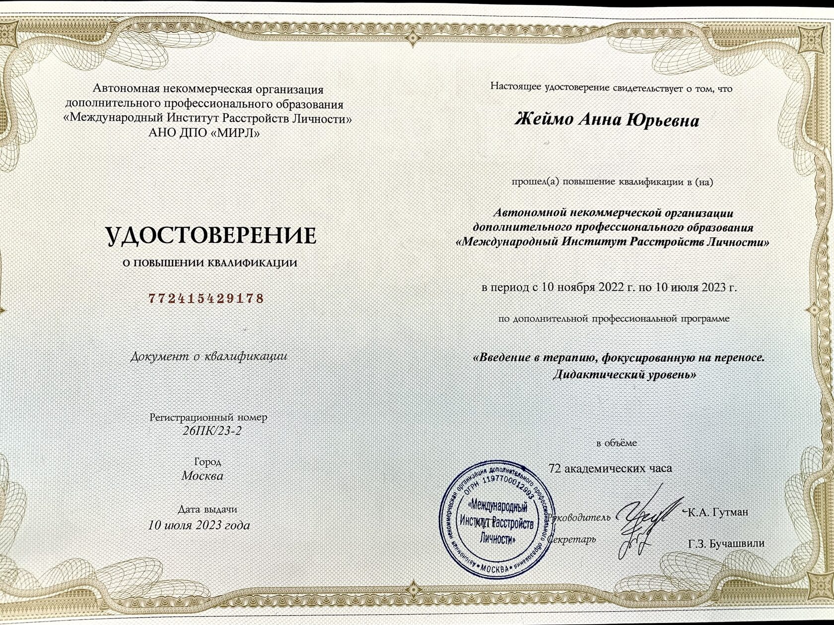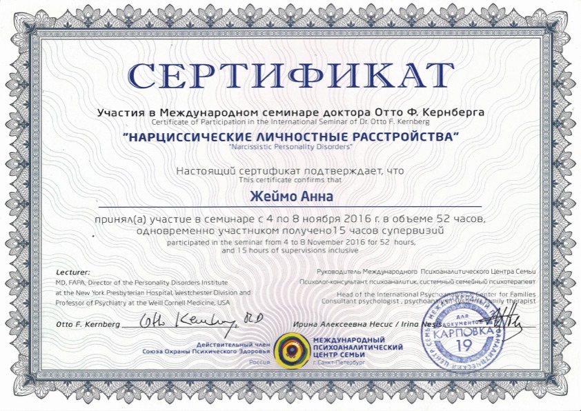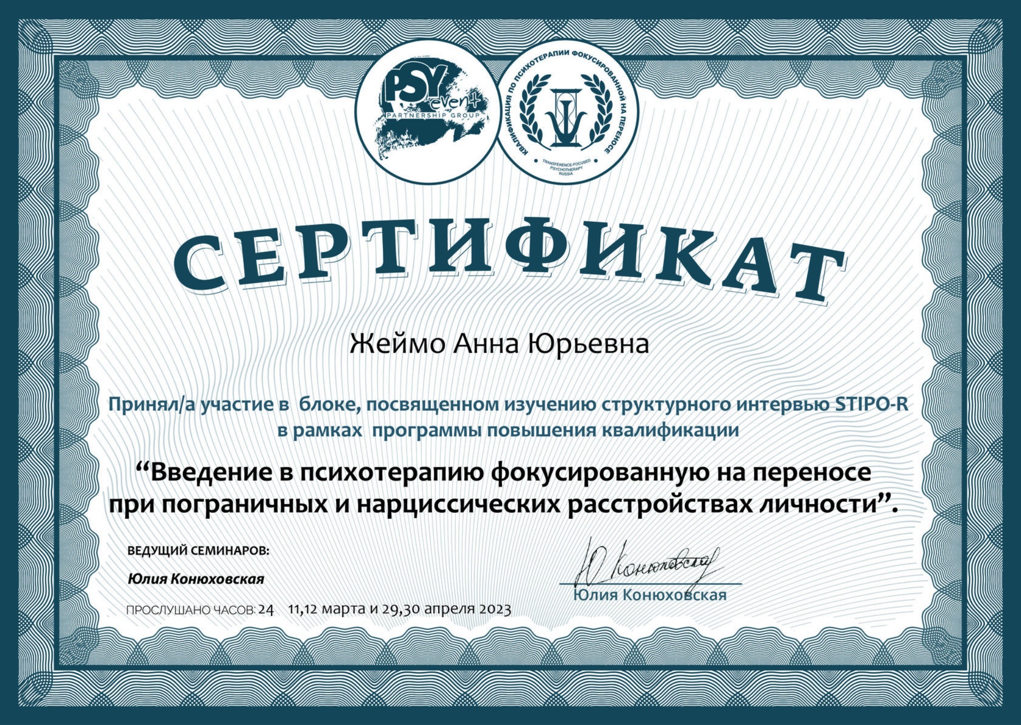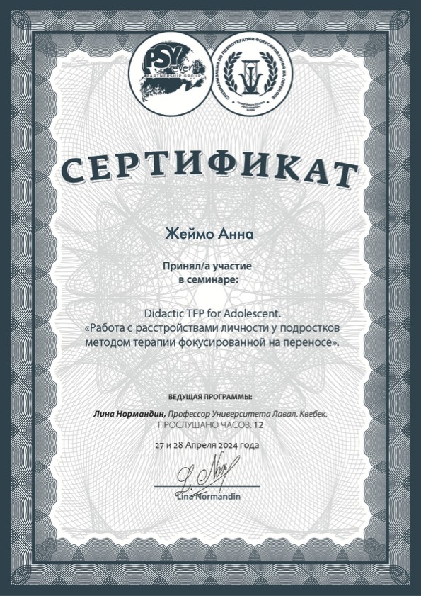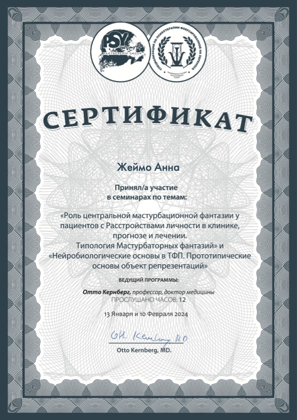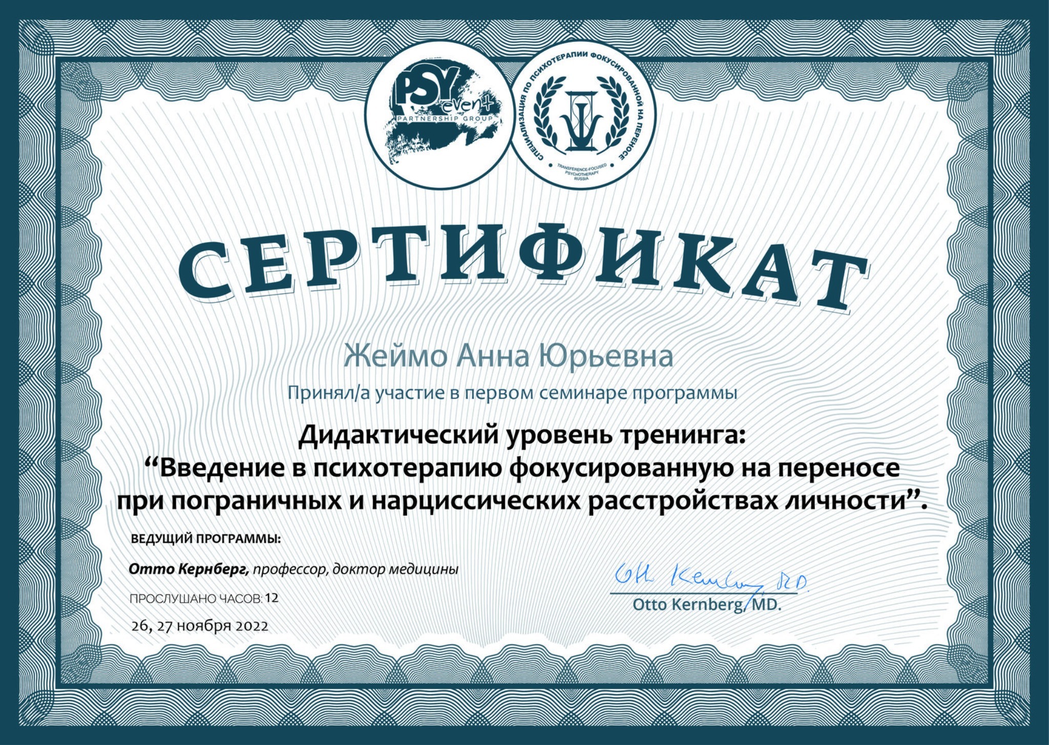 Терапия, фокусированная на переносе (TFP) (Русскоязычное общество ТФП, статус кандидата)