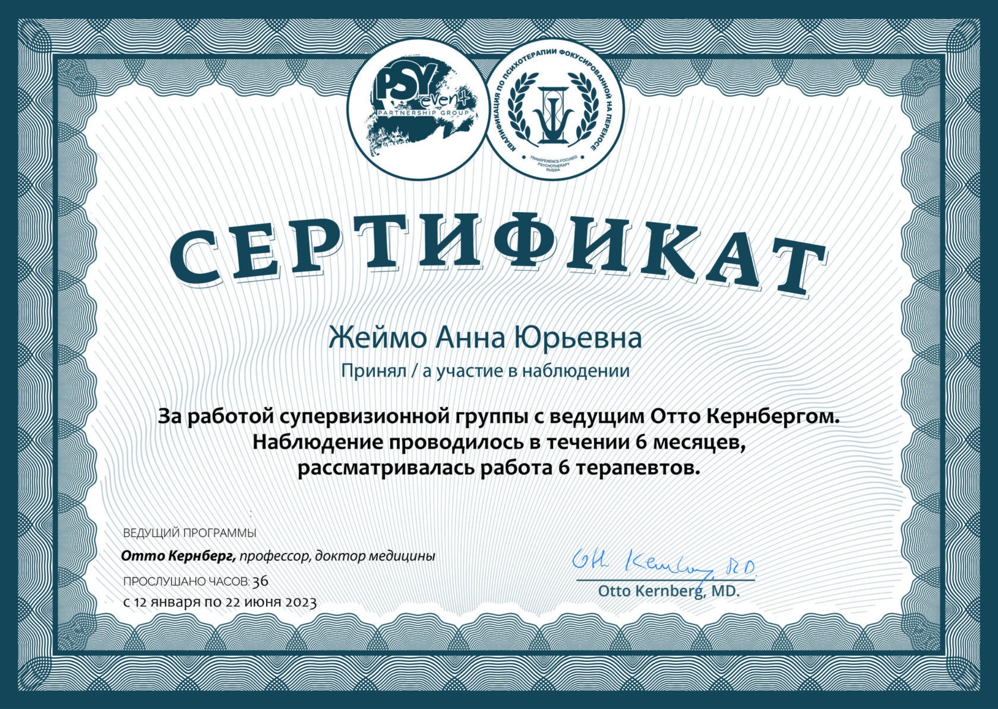 Моя профессиональная работа опирается на личную психотерапию (с 2016 года) и регулярную индивидуальную и групповую супервизию (с 2018 года).