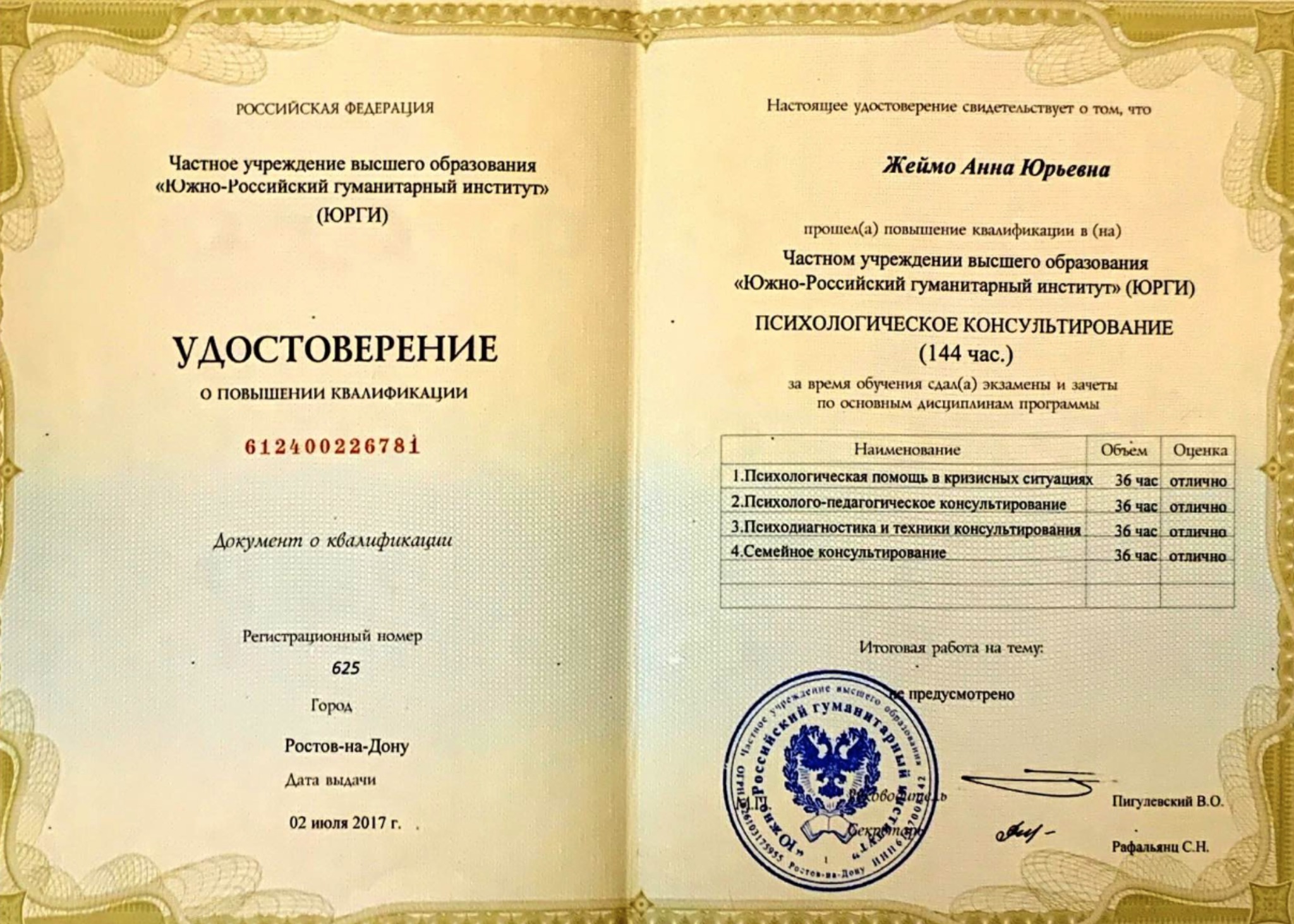 Повышение квалификации «Психологическое консультирование» — 144 часа, 2017