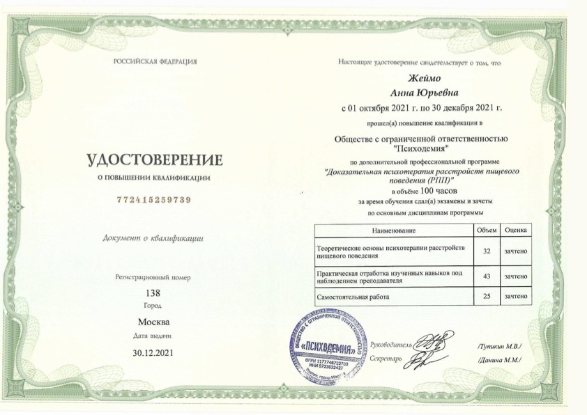 Доказательная психотерапия расстройств пищевого поведения — 100 часов, 2021