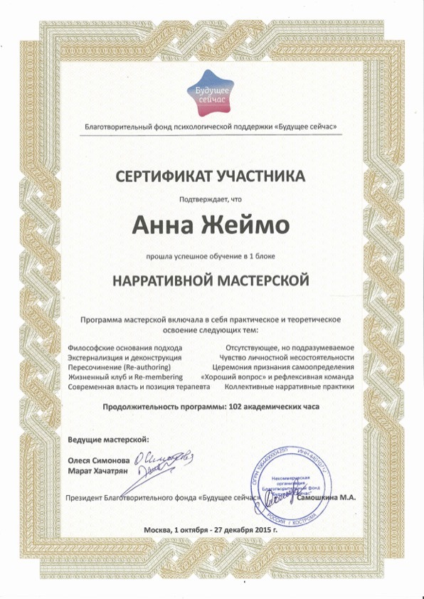 Мастерская нарративной практики, 1 блок — 102 часа, 2015